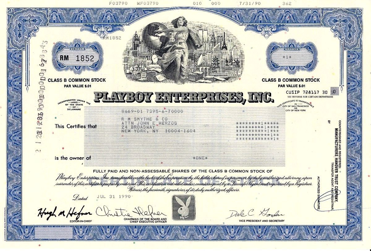 Gift Playboy Enterprises Stock Real Ownership Stock Certificate In Our Paper Frame